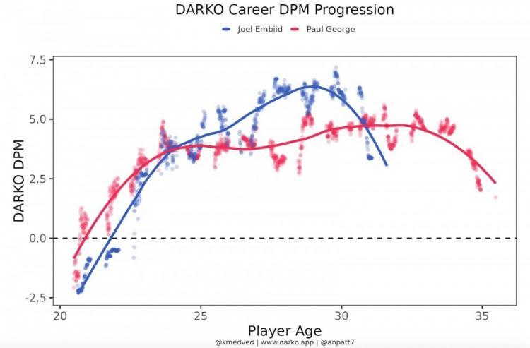 横轴为年龄,纵轴为量化后的表现;蓝色代表恩比德,红色代表乔治